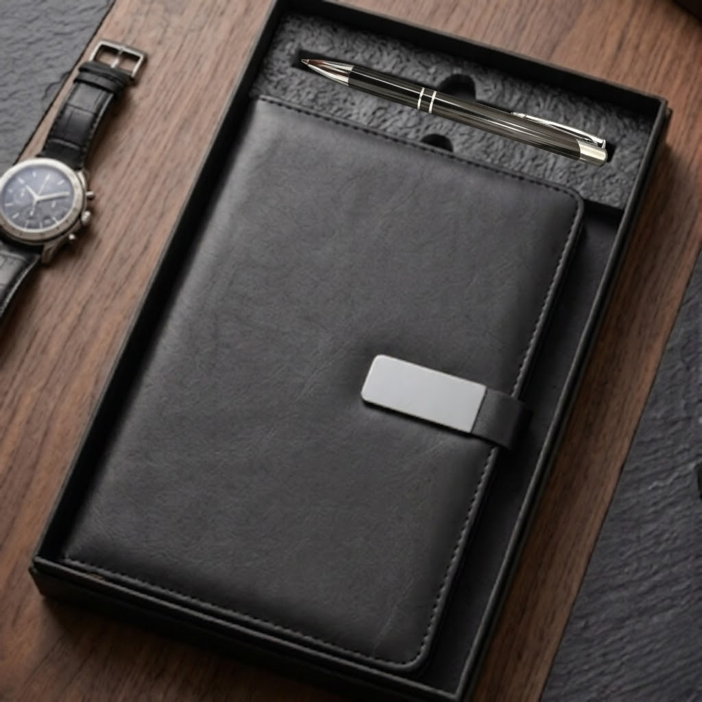 This overhead view showcases a premium executive gift set, perfect for corporate clients or employees. A high-quality black leather journal rests at the center. It features matte leather, precise stitching, and a brushed silver metal latch. Nestled nearby is a matching black and silver ballpoint pen within a custom foam tray.
