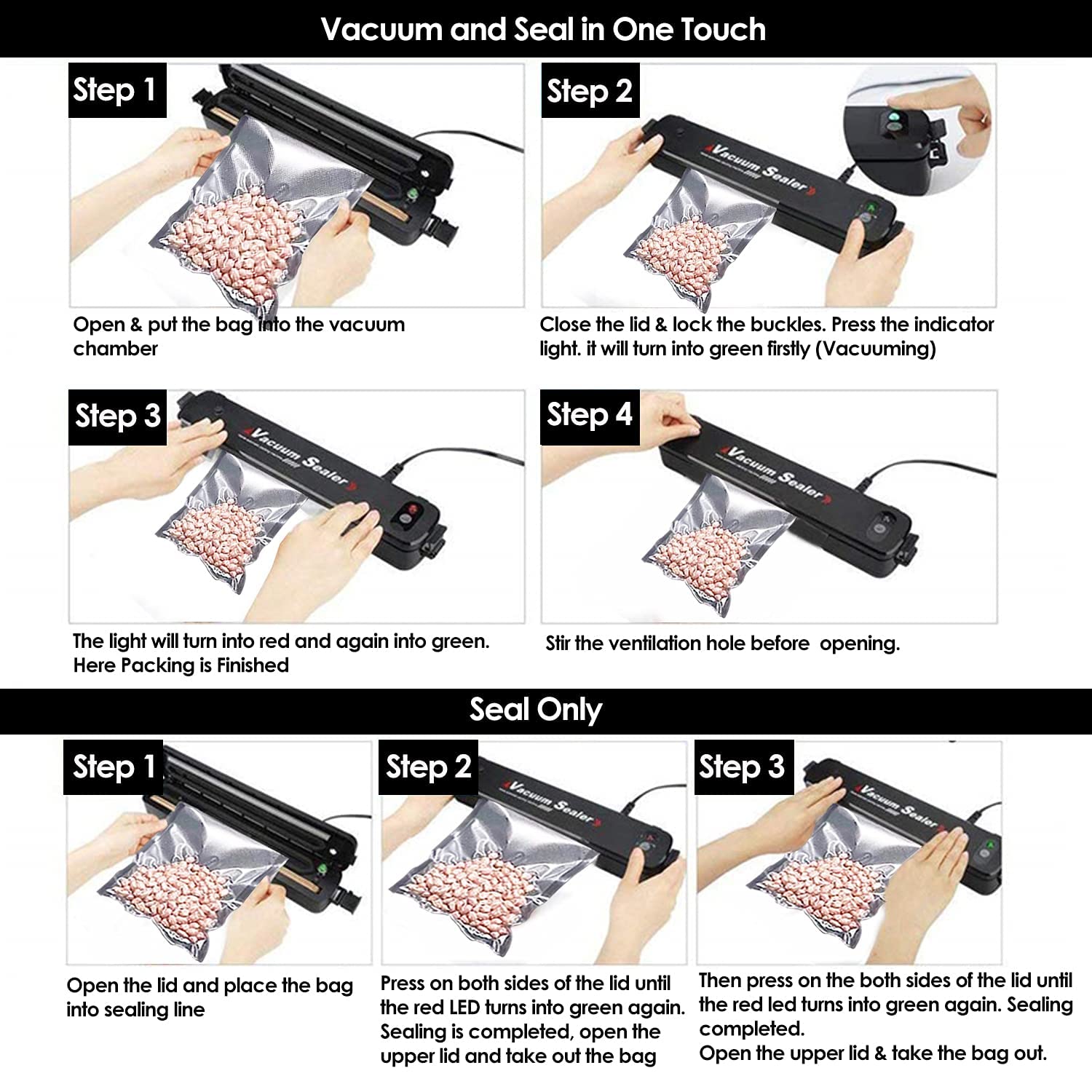 Reinforced vacuum pump to shorten vacuuming time | Constant temperature heating seal | Splash Water design | Absorbent venting design | Keep food fresher for longer.